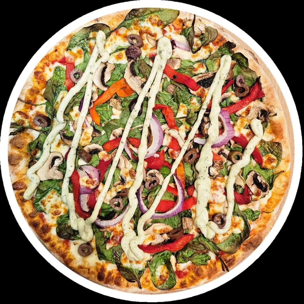12" Large Pizza. Baby Spinach, Mushrooms, Grilled Eggplant, Roasted Capsicum, Spanish Onions, Sun-Dried Tomatoes and Topped with Australian Vegan Mozzarella Cheese on a Tomato Base, Garnished with Our House Made Vegan Pesto Aioli