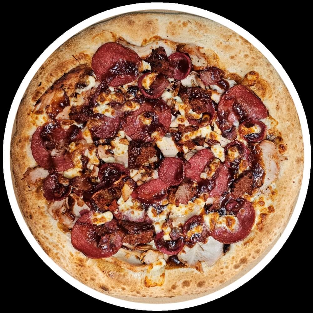 12" Large Pizza. Smoked Ham, Calabrese Pepperoni, Spanish Chorizo, House Cooked Chicken, House Cooked Ground Beef and Bacon on a BBQ Base. Topped with Australian Mozzarella Cheese