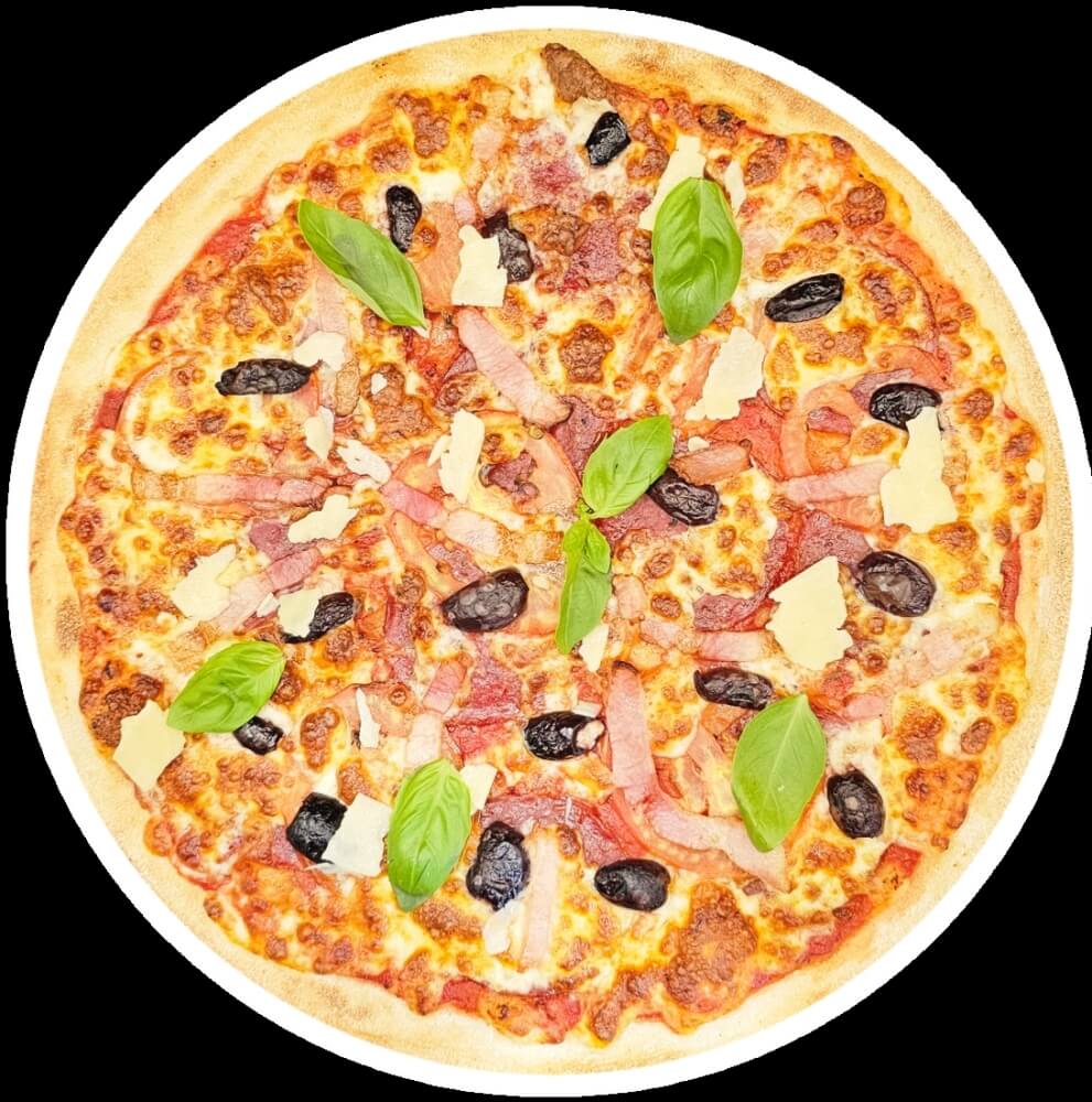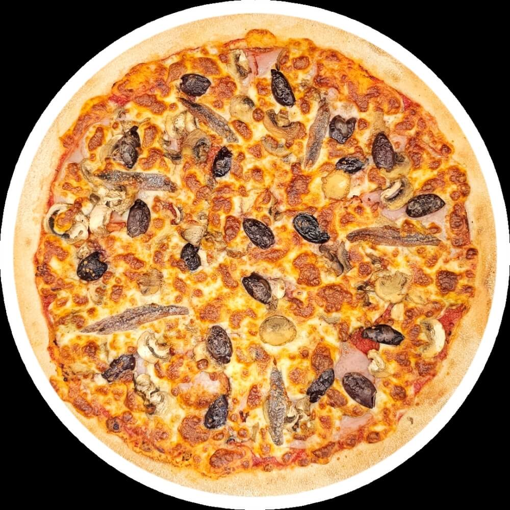 12" Large Pizza. Smoked Ham, Mushrooms and Kalamata Olives on a Tomato Base. Topped with Australian Mozzarella Cheese
