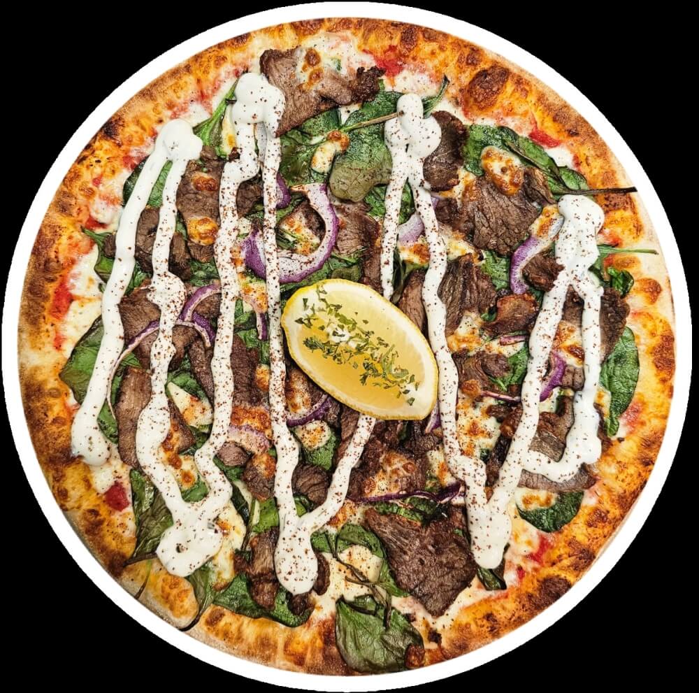 12" Large Pizza. House Cooked Roast Lamb in Moroccan Spices, Baby Spinach, Spanish Onions on a Tomato Base, Garnished with Herb Yoghurt and a Lemon Wedge. Topped with Australian Mozzarella Cheese