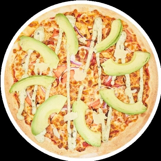 12" Large Pizza. House Cooked Chicken, Spanish Onions, Roasted Tomatoes on a Tomato, Garlic Base, Garnished with Avocado, Parmesan and Our House Made Pesto Aioli. Topped with Australian Mozzarella Cheese