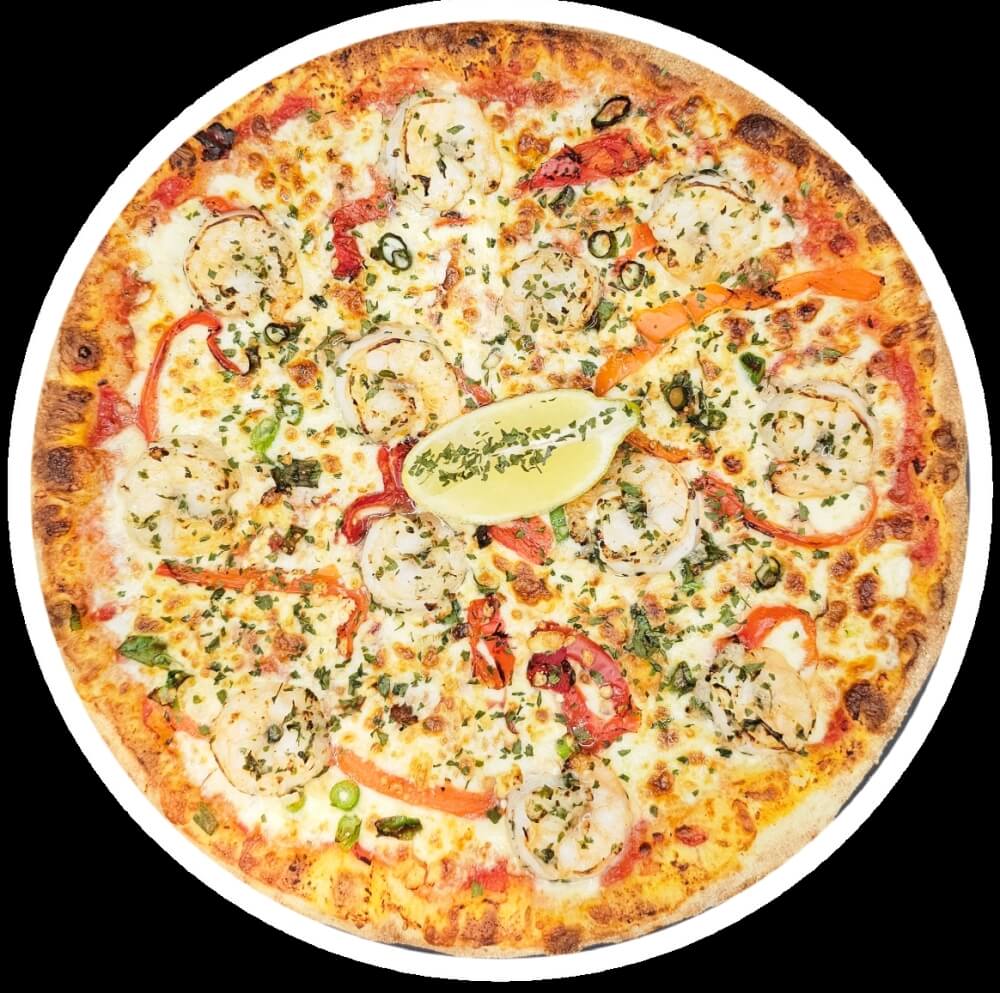 12" Large Pizza. Marinated Prawns, Sun-Dried Tomatoes, Roasted Capsicum, Shallots on a Tomato Base, Garnished with Parsley and a Lemon Wedge. Topped with Australian Mozzarella Cheese