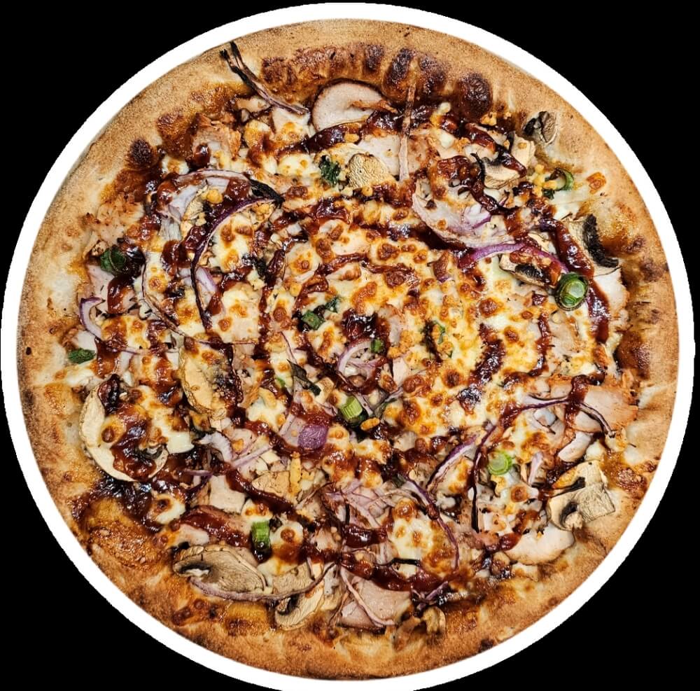 12" Large Pizza. House Cooked Chicken, Mushrooms, Spanish Onions and Shallots on a BBQ Base. Topped with Australian Mozzarella Cheese